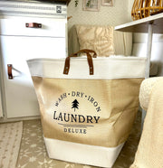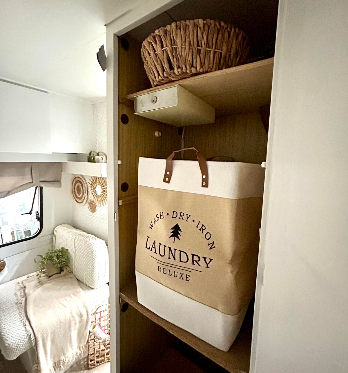 Deze ruime, opvouwbare wasmand is de perfecte mix van functionaliteit en stijl. Met zijn stevige kunstlederen hengsels en open bovenkant verplaats je de was moeiteloos naar de wasmachine. Het lichte, natuurlijke design met subtiele Laundry-print past prachtig bij een caravaninterieur, maar staat net zo mooi in de badkamer, slaapkamer of wasruimte thuis. Kleur beige met wit.